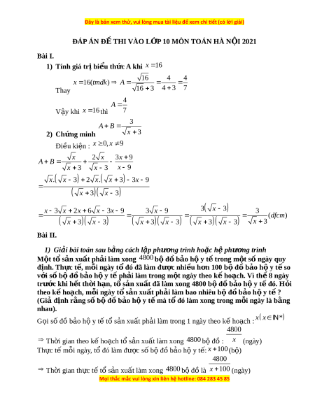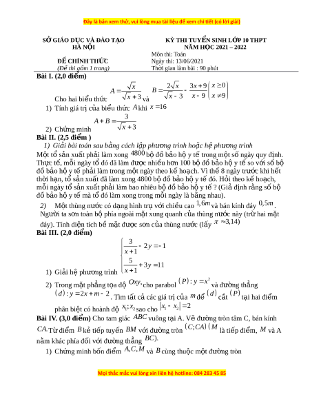 NĂM HỌC 2021 – 2022 Môn thi: Toán Đ C Ề HÍNH TH C Ứ Ngày thi: 13/06/2021 (Đề thi g m ồ 1 trang) Th i ờ gian làm bài : 90 phút Bài I. (2,0 đi m ể ) x 2 x 3x 9 x 0 A B Cho hai bi u t ể h c ứ x 3 và x 3 x 9 x 9 1) Tính giá tr c ị a ủ bi u ể th c ứ A khi x 1 6 3 A B 2) Ch ng ứ minh x 3 Bài II. (2,5 đi m ể ) 1) Gi i ả bài toán sau b ng ằ cách l p ph ậ ư ng ơ trình ho c ặ h ph ệ ư ng t ơ rình M t ộ tổ s n ả xuất ph i ả làm xong 4800 b đ ộ ồ b o h ả y t ộ ế trong m t ộ số ngày quy định. Th c t ự , m ế
