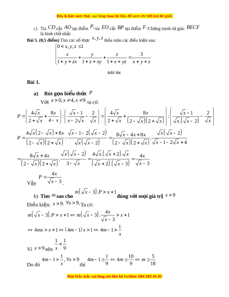 y zx 1 z xy 1 x yz x y z ĐÁP ÁN Bài 1. a) Rút g n bi ọ u t ể h c ứ P V i ớ x 0, x 4 , x 9 ta có: 4 x 8x x 1 2 4 x 8x x 1 2 P : : 2 x 4 x x 2 x x 2 x