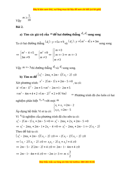 ơ trình đã cho luôn có hai nghiệm phân bi t ệ x , x 1 2 v i ớ m i ọ m x x 2 m 2 1 2 Áp d ng ụ h t ệ h c ứ Vi et ta có: x x 2 m 5 1 2 Vì x1là nghi m ệ c a ủ phư ng t ơ rình đã cho nên ta có: 2