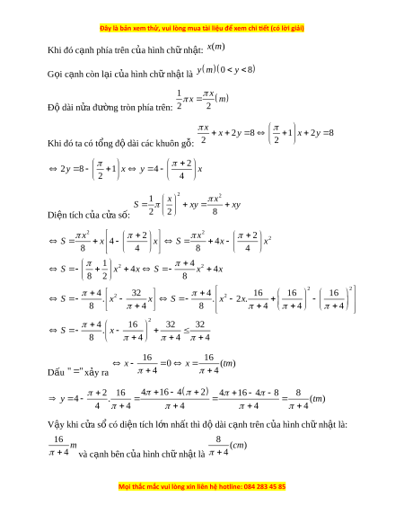 V y khi c a s có di n tích l n nh t thì đ dài c nh trên c a hình ch nh t là:ậ ử ổ ệ ớ ấ ộ ạ ủ ữ ậ