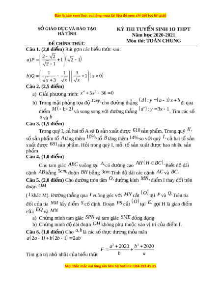 SỞ GIÁO D C Ụ VÀ ĐÀO T O Ạ KỲ THI TUY N Ể SINH 1O THPT HÀ TĨNH Năm h c 2020- ọ 2021 Môn thi: TOÁN CHUNG Đ C Ề HÍNH TH C Ứ Câu 1. (2,0 đi m ể ) Rút g n các ọ bi u t ể h c s ứ au: 2 2 a)P 1 2 1 2 1 1 1 3 b)Q 1 x 0 x 3 x x Câu 2. (2,5 đi m ể ) a) Gi i ả phư ng t ơ rình: 4 2