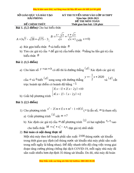 SỞ GIÁO D C Ụ VÀ ĐÀO T O Ạ KỲ THI TUY N Ể SINH VÀO L P Ớ 10 THPT H I Ả PHÒNG Năm h c ọ 2020-2021 Đ Ề THI MÔN TOÁN Đ C Ề HÍNH TH C Ứ Th i