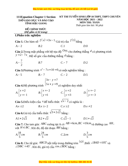 Ớ 10 THPT, THPT CHUYÊN 1SỞ GIÁO D C Ụ VÀ ĐÀO T O Ạ NĂM H C Ọ 2021 – 2022 T N Ỉ H H U Ậ GIANG MÔN THI: TOÁN Th i