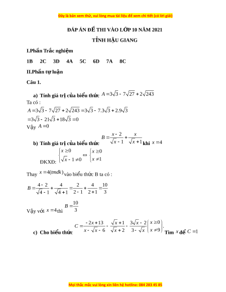 ĐÁP ÁN Đ Ề THI VÀO L P Ớ 10 NĂM 2021 T N Ỉ H HẬU GIANG I.Phần Trắc nghi m ệ 1B 2C 3D 4A 5C 6D 7A 8C II.Phần t l ự u n ậ Câu 1. a) Tính giá tr c ị a bi ủ u t ể h c ứ A 3 3 7 27 2 243 Ta có : A 3 3 7 27 2 243 3 3 7.3 3 2.9 3 3 3 21 3 18 3 0 V y ậ A 0 x 2 x B b) Tính giá tr c ị a bi ủ u t ể h c ứ x 1