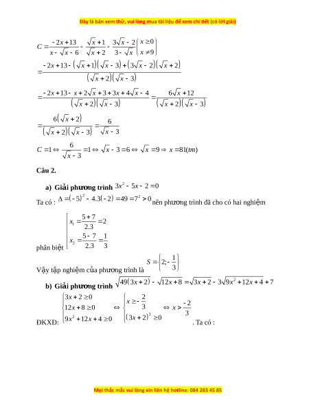 x 1 3 x 2 x 0 C . c) Cho bi u t ể h c ứ x x 6 x 2 3 x x 9 Tìm x đ ể C 1 Câu 2. a) Gi i ả phư ng t ơ rình 2