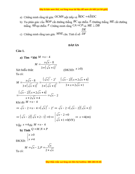 minh rằng tam giác MNE cân. Tính t ỉ s ố DF ĐÁP ÁN Câu 1.