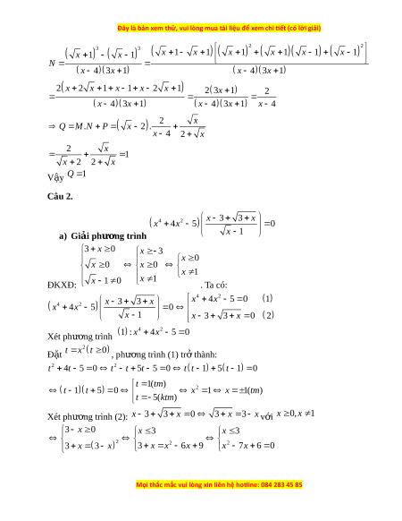 x 4 3x 1 x 4 N P x 2 x Q M. 2 . x 4 2 x 2 x 1 x 2 2 x V y ậ Q 1 Câu 2. 4 2 x x 3 3 x x 4 5 0 a) Giải phư ng t ơ rình x 1 3 x 0 x 3 x 0 x 0 x 0 x 1 x 1 ĐKXĐ: x 1 0 . Ta có: 4 2