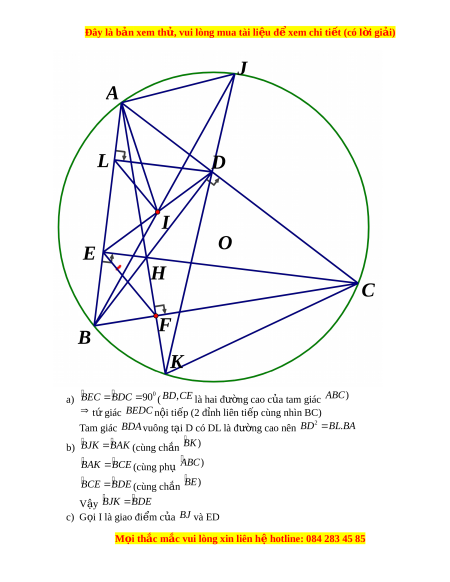 K A .G i ọ L là hình chi u c ế a ủ D lên AB. a) Ch ng ứ minh r ng t ằ gi ứ ác BEDC n i ộ ti p và ế 2 BD . BL BA b) G i ọ J là giao đi m ể c a