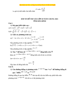 a b P ab ab Tìm giá trị nh nh ỏ ất c a bi ủ u t ể h c ứ ĐÁP ÁN Đ Ề THI VÀO L P Ớ 10 TOÁN CHUNG 2021 T N Ỉ H HÒA BÌNH Câu I. 1) Rút g n bi ọ u t ể h c s ứ au : a)A 4 3 27 4 3 3 3 3