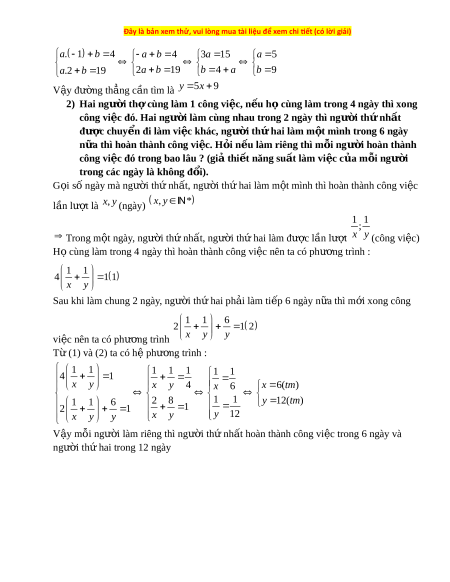 . a 1 b 4 a b 4 3 a 15 a 5 .2 a b 19 2a b 19 b 4 a b 9 V y ậ đư ng t ờ h ng ẳ c n t ầ ìm là y 5 x 9 2) Hai ngư i ờ th cùng l ợ àm 1 công vi c, n ệ u h ế cùng l ọ