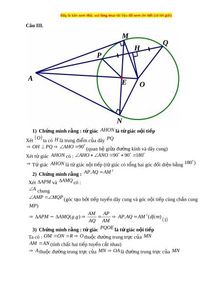 Xét tứ giác AHON có : A HO A NO 9 0 90 1 80 T gi ứ ác AHON là t gi ứ ác n i ộ ti p ( ế tứ giác có t ng hai ổ góc đ i ố di n b ệ ng ằ 180 ) 2 2) Chứng minh r ng : ằ . AP AQ AM