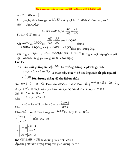 ủ PQ, E là giao đi m ể c a ủ AO và MN 1) Ch ng ứ minh r ng : ằ t gi ứ ác AHON là t gi ứ ác n i ộ ti p ế 2 2) Ch ng ứ minh r ng : ằ . AP AQ AM 3) Ch ng ứ minh r ng : ằ t gi ứ ác PQOE là t gi ứ ác n i ộ ti p ế Câu IV. (1,0 đi m ể ) 1) Trên m t ặ ph ng t ẳ a ọ đ ộ Oxy, cho đư ng ờ th ng có ph ẳ ư ng ơ trình y