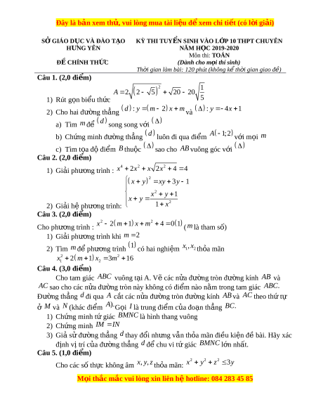 ệ xem ể chi ti t ế (có l i ờ gi i ả ) SỞ GIÁO D C Ụ VÀ ĐÀO T O Ạ KỲ THI TUY N Ể SINH VÀO L P Ớ 10 THPT CHUYÊN HƯNG YÊN NĂM H C Ọ 2019-2020 Môn thi: TOÁN Đ C Ề HÍNH TH C Ứ (Dành cho m i ọ thí sinh) Th i