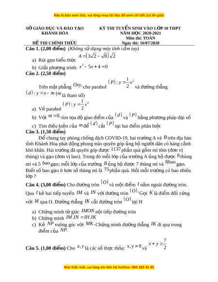SỞ GIÁO D C Ụ VÀ ĐÀO T O Ạ KỲ THI TUY N Ể SINH VÀO L P Ớ 10 THPT KHÁNH HÒA NĂM HỌC 2020-2021 Môn thi: TOÁN Đ Ề THI CHÍNH TH C Ứ Ngày thi: 16/07/2020 Câu 1. (2,00 đi m