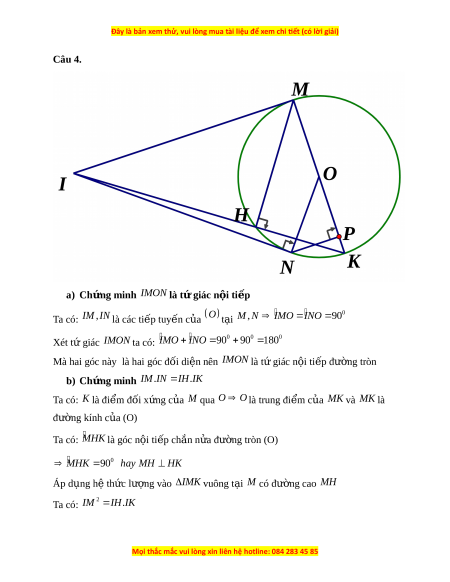 ế IM và IN v i ớ đư ng t ờ ròn O . G i ọ K là đi m ể đối x ng ứ v i ớ M qua O. Đư ng t ờ h ng ẳ IK c t ắ đư ng t ờ ròn O t i ạ H a) Ch ng ứ minh t gi ứ ác IMON n i ộ ti p đ ế ư ng ờ tròn b) Ch ng ứ minh IM.IN I H.IK