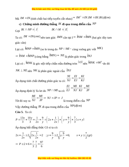 c) Kẻ NP vuông góc v i ớ MK. Ch ng m ứ inh đư ng ờ th ng ẳ IK đi qua trung đi m ể c a ủ N . P 7 x y Câu 5. (1,00 đi m