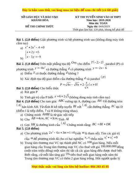 ệ xem ể chi ti t ế (có l i ờ gi i ả ) SỞ GIÁO D C Ụ VÀ ĐÀO T O Ạ KỲ THI TUY N Ể SINH VÀO 10 THPT KHÁNH HÒA Năm h c ọ : 2019-2020 Môn thi: TOÁN Đ Ề THI CHÍNH TH C Ứ Ngày thi: 04/6/2019