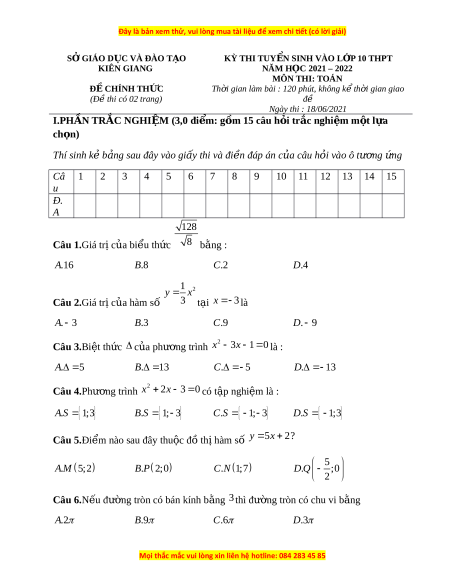 Đề thi vào 10 môn Toán tỉnh Kiên Giang năm 2022