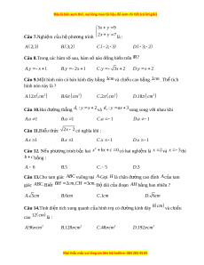 ấ thi và đi n đáp án c ề a câu h ủ i ỏ vào ô tư ng ơ ng ứ Câ 1 2 3 4 5 6 7 8 9 10 11 12 13 14 15 u Đ. A 128 Câu 1.Giá tr c ị a bi ủ u t ể h c ứ 8 b ng : ằ . A 16 . B 8 C.2 . D 4 1 2 y x Câu 2.Giá tr c ị a hàm ủ số 3 t i ạ x 3 là . A 3 . B 3 C.9 . D 9 Câu 3.Biệt th c ứ c a ph ủ ư ng ơ trình 2 x 3x 1 0 là : . A 5 . B 1 3 C. 5 . D 13 Câu 4.Phư ng ơ trình 2 x 2x 3 0 có t p nghi ậ ệm là : . A S 1; 3 . B S 1; 3 C.S 1; 3 . D S 1; 3 Câu 5.Đi m ể nào sau đây thu c ộ đ t ồ h hàm ị s ố y 5 x 2? 5 . A M 5;2 . B P 2;0 C.N 1;7 . D Q ;0 2 Câu 6.N u ế đư ng t ờ ròn có bán kính b ng ằ 3 thì đư ng ờ tròn có chu vi b ng ằ . A 2 . B 9 C.6 . D 3