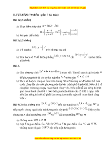 II.TỰ LUẬN (7,0 đi m ể : g m ồ 5 bài toán) Bài 1.(1,5 đi m ể ) a) Th c hi ự n phép t ệ ính A 112 63 x 4 1 x 0 B 2 x : b) Rút g n bi ọ u t ể h c ứ x 2 x 2 x 4 Bài 2.(1,5 đi m ể ) 1 P 2 : y x a) Vẽ parabol 2 trên h t ệ r c ụ t a đ ọ ộ 1 P 2 : y x b) Tìm tham s ố m đ đ ể ư ng t ờ h ng