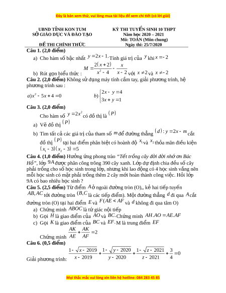 UBND T N Ỉ H KON TUM KỲ THI TUY N Ể SINH 10 THPT SỞ GIÁO D C Ụ VÀ ĐÀO T O Ạ Năm h c ọ 2020 – 2021 Mô: TOÁN (Môn chung) Đ Ề THI CHÍNH TH C Ứ Ngày thi: 25/7/2020 Câu 1. (2,0 đi m ể ) a) Cho hàm số b c ậ nh t ấ y 2