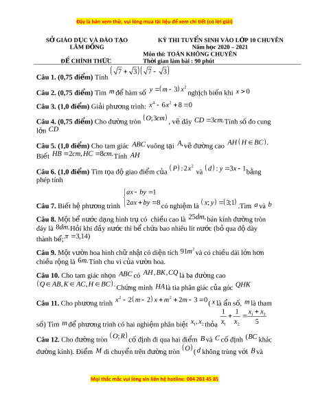 Đề thi vào 10 môn Toán tỉnh Lâm Đồng (Hệ không chuyên) năm 2021