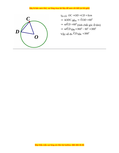 Ta có: OC O D C D 3 cm O DC đ u ề 0 COD 6 0 0 sd CD 6 0 (tính ch t ấ góc t ở âm) sd CD l n ớ 0 0 0 3 60 60 3 00 V y ậ số đo CD l n ớ 0 3 00