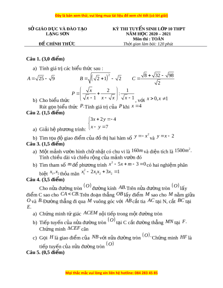 Đề thi vào 10 môn Toán tỉnh Lạng Sơn (Hệ không chuyên) năm 2021