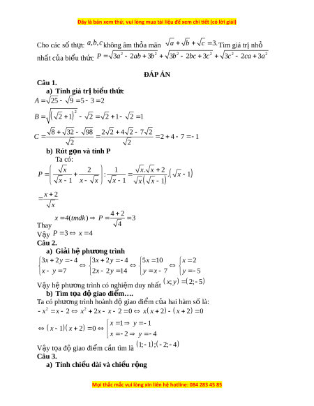 ứ P 3a 2ab 3b 3b 2bc 3c 3c 2ca 3a ĐÁP ÁN Câu 1. a) Tính giá tr bi ị u t ề h c ứ A 25 9 5 3 2 B 2 2 1 2 2 1 2 1 8 32 98 2 2 4 2 7 2 C 2 4 7 1 2 2 b) Rút g n và t ọ ính P Ta có: x 2 1 x. x 2 P : . x 1 x 1 x x x 1 x x 1 x 2 x 4 2 x 4(tmdk) P 3 Thay 4 V y ậ P 3 x 4 Câu 2. a) Giải h p ệ hư ng t ơ rình 3