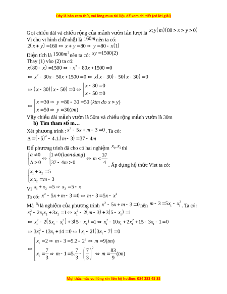 ậ có chu vi là 160m và diện tích là 2 1500m . Tính chi u dài ề và chi u r ề ng c ộ a ủ m nh v ả ư n ờ đó b) Tìm tham s ố m đ ph ể ư ng t ơ rình 2