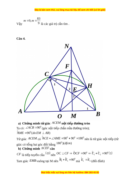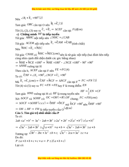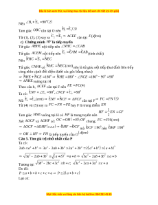 ể M sao cho M n m ằ gi a ữ O và . B Đư ng ờ th ng đi ẳ qua M vuông góc v i ớ AB c t ắ tia AC t i ạ N, c t ắ BC t i ạ E. a) Ch ng ứ minh t gi ứ ác ACEM n i ộ ti p t ế rong m t ộ đư ng t ờ ròn b) Ti p t ế uy n c ế a ủ n a đ ử ư ng t ờ ròn O t i ạ C c t ắ đư ng ờ th ng ẳ MN t i ạ F. Ch ng ứ minh CE F cân c) G i ọ H là giao đi m ể c a ủ NB v i ớ n a ử đư ng t ờ ròn O .Ch ng m ứ inh HF là ti p t ế uy n c ế a ủ n a đ ử ư ng ờ tròn O Câu 5. (0,5 đi m ể )