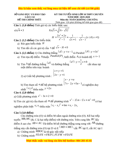 ệ xem ể chi ti t ế (có l i ờ gi i ả ) SỞ GIÁO D C Ụ VÀ ĐÀO T O Ạ KỲ THI TUY N Ể SINH L P Ớ 10 THPT CHUYÊN LÀO CAI NĂM H C Ọ 2019-2020 Đ Ề THI CHÍNH TH C Ứ