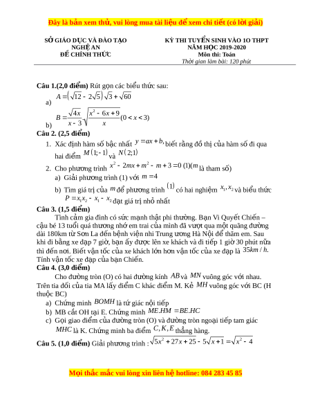 ệ xem ể chi ti t ế (có l i ờ gi i ả ) SỞ GIÁO D C Ụ VÀ ĐÀO T O Ạ KỲ THI TUY N Ể SINH VÀO 1O THPT NGHỆ AN NĂM HỌC 2019-2020 Đ C Ề HÍNH TH C Ứ Môn thi: Toán Th i