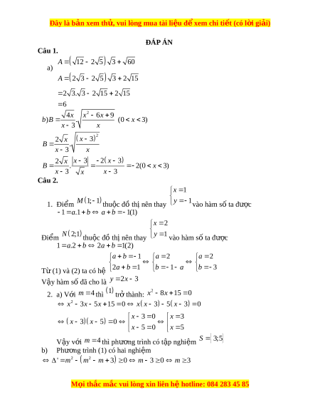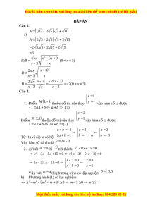 ệ xem ể chi ti t ế (có l i ờ gi i ả ) ĐÁP ÁN Câu 1. A 12 2 5 3 60 a) A 2 3 2 5 3 2 15 2 3. 3 2 15 2 15 6 2 4x x 6x 9 b)B . (0 x 3) x 3 x 2 x x 3 2 B . x 3 x 2 x x 3 2 x 3 B . 2(0 x 3) x 3 x x 3 Câu 2. x 1 1. Đi m ể M 1; 1 thu c ộ đồ th nên t ị hay y 1 vào hàm số ta đư c ợ 1 .