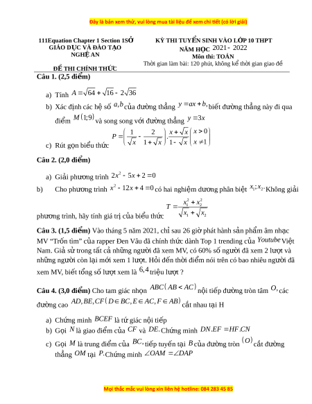 111Equation Chapter 1 Section 1SỞ KỲ THI TUY N Ể SINH VÀO L P Ớ 10 THPT GIÁO D C Ụ VÀ ĐÀO T O Ạ NĂM H C Ọ 2021 2022 NGHỆ AN Môn thi: TOÁN Th i