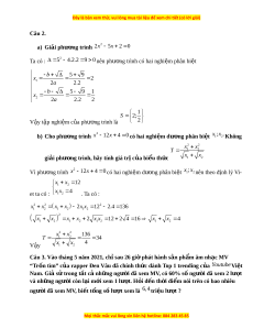 G i ọ x là số ngư i ờ đã xem MV ( tri u ng ệ ư i ờ ) x * Khi đó số ngư i ờ đã xem hai lư t ợ là 60%x 0 ,6x (ngư i ờ ) và số ngư i ờ ch xem ỉ 1 lư t ợ là 40%x 0 , 4x (ngư i ờ ) Vì tổng số lư t ợ xem là 6,4 tri u nên t ệ a có phư ng t ơ rình 0,6 . x 2 0,4 . x 1 1 ,6x 6 ,4 x 4 V y ậ có 4 tri u ng ệ ư i ờ xem MV. Câu 4.