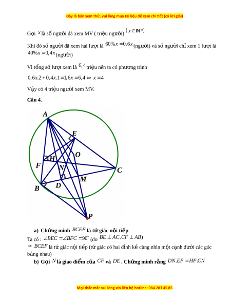 ờ cao AD, BE,CF D BC, E AC, F AB c t ắ nhau t i ạ H a) Ch ng ứ minh BCEF là t gi ứ ác n i ộ ti p ế b) G i ọ N là giao đi m ể c a
