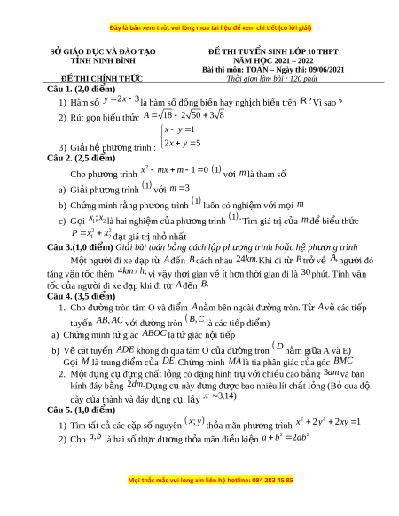 Đề thi vào 10 môn Toán tỉnh Ninh Bình năm 2022