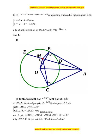 ờ gian đi là 30 phút. Tính v n ậ tốc c a ủ ngư i ờ đi xe đ p khi ạ đi t ừ A đ n ế . B Câu 4. (3,5 đi m ể ) 1. Cho đư ng t ờ ròn tâm O và đi m ể A n m ằ bên ngoài đư ng ờ tròn. T ừ A vẽ các ti p ế tuy n ế AB, AC v i ớ đư ng