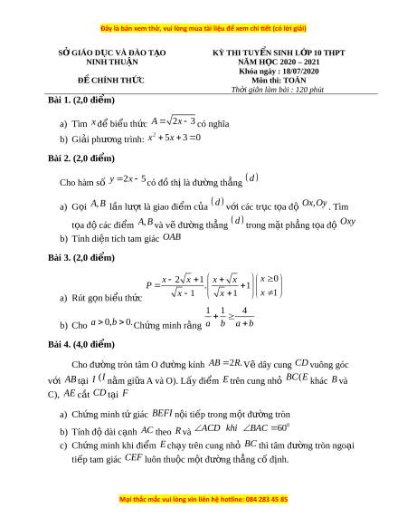 Đề thi vào 10 môn Toán tỉnh Ninh Thuận (Hệ không chuyên) năm 2021