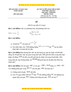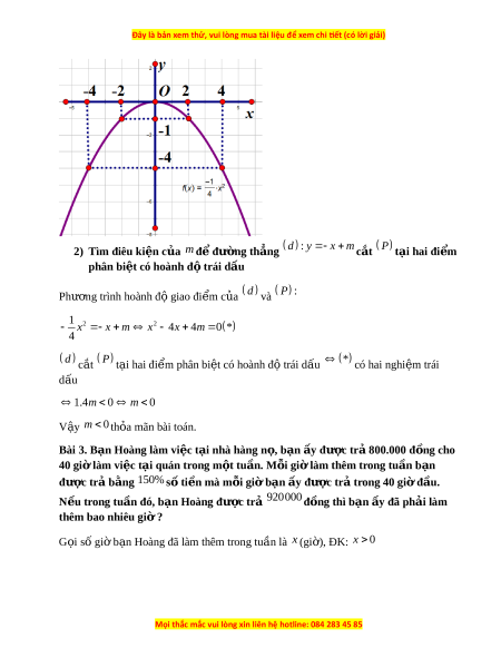 phân biệt có hoành độ trái d u . ấ Bài 3. (2,0 đi m ể ) B n H ạ oàng làm vi c t ệ i ạ nhà hàng n , b ọ n ạ y đ ấ ư c t ợ r 800.000 ả đồng cho 40 gi l ờ àm vi c t ệ i ạ quán trong m t ộ tu n. M ầ i ỗ gi l ờ àm thêm trong tu n b ầ n ạ đư c ợ trả b ng ằ 150% số ti n m ề à mỗi gi b ờ n ạ y đ ấ ược tr t ả rong 40 giờ đ u. N ầ u ế trong tu n đó, b ầ n ạ Hoàng đư c ợ tr ả 920000đồng thì b n ạ y đã ph ấ i ả làm thêm bao nhiêu giờ ? Bài 4. (4,0 đi m