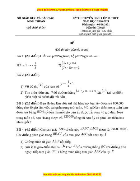 SỞ GIÁO D C Ụ VÀ ĐÀO T O Ạ KỲ THI TUY N Ể SINH L P Ớ 10 THPT NINH THU N Ậ NĂM HỌC 2020-2021