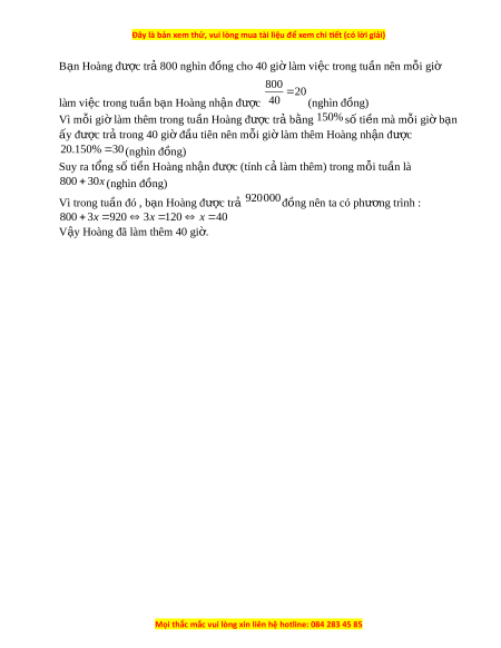 B n H ạ oàng được tr 800 nghì ả n đồng cho 40 gi l ờ àm vi c t ệ rong tu n nên m ầ i ỗ gi ờ 800 20 làm vi c t ệ rong tu n b ầ n ạ Hoàng nh n ậ đư c ợ 40 (nghìn đồng) Vì mỗi gi l ờ àm thêm trong tu n H ầ oàng đư c ợ tr b ả ng ằ 150% số ti n m ề à mỗi gi b ờ n ạ ấy đư c ợ trả trong 40 gi đ ờ ầu tiên nên mỗi gi l ờ àm thêm Hoàng nh n ậ đư c ợ 20.150% 3 0 (nghìn đồng) Suy ra tổng số ti n ề Hoàng nh n đ ậ ư c ợ (tính c l ả àm thêm) trong m i ỗ tu n l ầ à