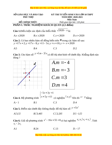SỞ GIÁO D C Ụ VÀ ĐÀO T O Ạ KỲ THI TUY N Ể SINH VÀO L P Ớ 10 THPT PHÚ THỌ NĂM HỌC 2020-2021 Môn Toán Đ C Ề HÍNH TH C Ứ Th i