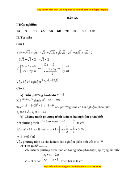ĐÁP ÁN I.Trắc nghi m ệ 1A 2C 3D 4A 5B 6D 7D 8C 9C 10B II. Tự luận Câu 1. a P 2 ) 45 9 4 5 9.5 5 2 3 5 5 2 3 5 5 2 4 5 2 12 y 12 2x 5 y 9 x 2 b) 9 5y 2x 7 y 3 x y 1 2 V y ậ h có nghi ệ m ệ ; x y 2; 1 Câu 2. a) Giải phư ng t ơ rình khi m 2 Khi m 2 , pt thành 2 x 4x 1 0 Ta có: 2 ' 2 1.1 3 0, nên phư ng ơ trình có hai nghi m ệ phân bi t ệ : x 2 3; x 2 3 1 2 b) Chứng minh phư ng