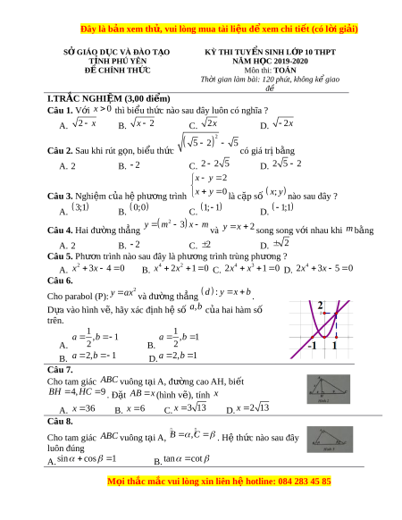 ệ xem ể chi ti t ế (có l i ờ gi i ả ) SỞ GIÁO D C Ụ VÀ ĐÀO T O Ạ KỲ THI TUY N Ể SINH L P Ớ 10 THPT T N Ỉ H PHÚ YÊN NĂM H C Ọ 2019-2020 Đ C Ề HÍNH TH C Ứ Môn thi: TOÁN Th i