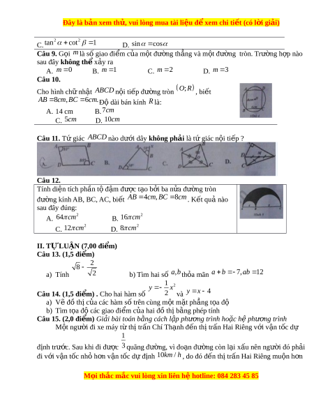 m Độ dài bán kính R là: A. 14 cm B.7cm C. 5cm D. 10cm Câu 11. T gi ứ ác ABCD nào dư i ớ dây không ph i ả là t gi ứ ác n i ộ ti p ? ế Câu 12. Tính di n t ệ ích ph n t ầ đ ộ m ậ đư c t ợ o ạ b i ở ba n a đ ử ư ng ờ tròn đư ng ờ kính AB, BC, AC, bi t ế AB 4 c , m BC 8 cm . K t ế qu nào ả sau đây đúng: A. 2 64 cm B. 2 16 cm C. 2 12 cm D. 2 8 cm II. T L Ự UẬN (7,00 đi m ể ) Câu 13. (1,5 đi m ể ) 2 8 a) Tính 2 b) Tìm hai s ố a,bth a m ỏ