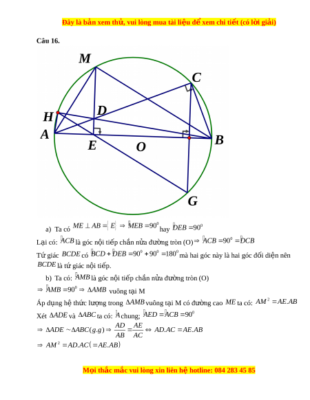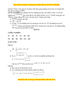 ờ tròn CA CB .Trên cung nh ỏ AC l y đi ấ m ể M khác A và C. V M ẽ E vuông góc v i ớ AB t i ạ E. Đo n ạ th ng ẳ ME và AC c t ắ nhau t i ạ D. Ch ng ứ minh r ng: ằ a) BCDE là t gi ứ ác n i ộ ti p ế b) 2 AM . AD AC c) Vẽ dây CG c a ủ đư ng t ờ ròn (O) vuông góc v i ớ AB. Tia GE c t ắ đư ng t ờ ròn t i ạ H H G , ch ng ứ minh r ng ằ khi đi m ể M di chuy n t ể rên cung nh ỏ AC thì đư ng t ờ h ng ẳ HD luôn đi qua m t ộ đi m ể cố đ nh. ị ĐÁP ÁN I.TRẮC NGHI M Ệ 1C 2B 3C 4A 5B 6D 7D 8B 9D 10C 11A 12D II.TỰ LUẬN Câu 13. 2 8 2 2 2 2 a) 2 S a b 7 b) Ta có: P ab 12