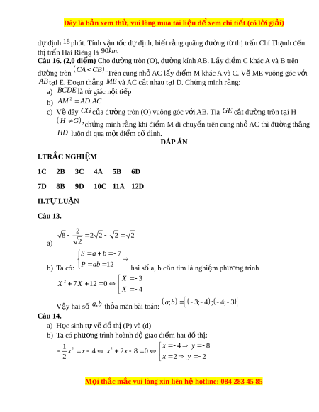 ệ xem ể chi ti t ế (có l i ờ gi i ả ) d đ ự ịnh 18 phút. Tính v n ậ tốc dự định, bi t ế r ng quãng ằ đư ng t ờ t ừ h t ị r n C ấ hí Th nh ạ đ n ế thị tr n H ấ ai Riêng là 90k . m Câu 16. (2,0 đi m ể ) Cho đư ng ờ tròn (O), đư ng ờ kính AB. L y đi ấ m ể C khác A và B trên đư ng