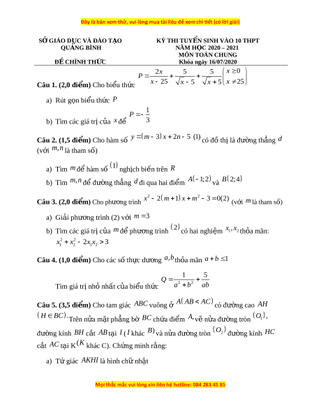 SỞ GIÁO D C Ụ VÀ ĐÀO T O Ạ KỲ THI TUY N Ể SINH VÀO 10 THPT QU N Ả G BÌNH NĂM H C Ọ 2020 – 2021 MÔN TOÁN CHUNG Đ C Ề HÍNH TH C Ứ Khóa ngày 16/07/2020 2x 5 5 x 0 P Câu 1. (2,0 đi m ể ) Cho bi u t ể h c ứ x 25 x 5 x 5 x 25 a) Rút g n bi ọ u t ể h c ứ P 1 P b) Tìm các giá tr c ị a ủ x đ ể 3 Câu 2. (1,5 đi m